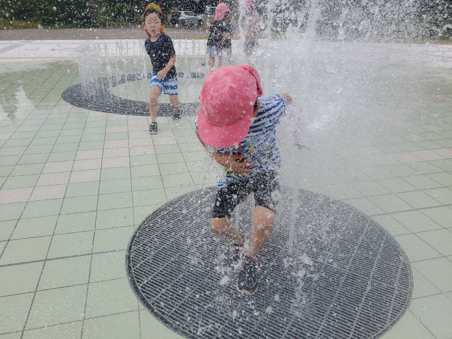 秋田県立北欧の杜の「噴水広場」に行きました。不規則に出てくる噴水に大興奮し、森の中は子ども達の「きゃー!!」という歓声で賑やかになりました。
